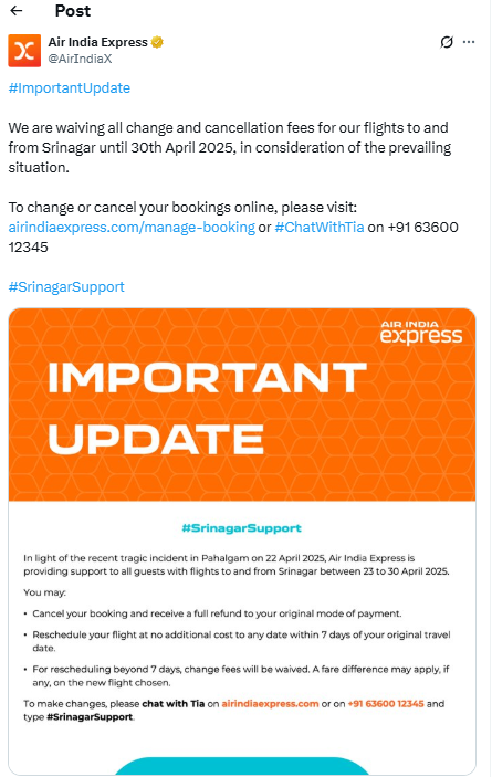 हाल ही में हुए पहलगाम आतंकवादी हमले के बाद एयर इंडिया एक्सप्रेस 30 अप्रैल, 2025 तक श्रीनगर से आने-जाने वाली उड़ानों पर रद्दीकरण शुल्क नहीं लेगी। पहलगाम आतंकी हमले के मद्देनजर, एयर इंडिया एक्सप्रेस 30 अप्रैल, 2025 तक श्रीनगर से आने-जाने वाली उड़ानों के लिए रद्दीकरण शुल्क माफ करेगी।